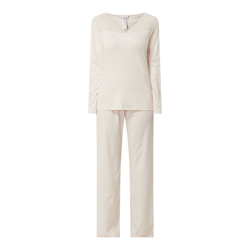 Piżama damska HANRO , Bawełna merceryzowana , Luźny krój , Góra ze wstawką w kontrastowym kolorze z koronki , Dekolt w serek , Długie rękawy , Spodnie z elastycznym pasem, Długość tyłu górnej części w rozmiarze S: 63 cm , Długość rękawa w rozmiarze S: 61 cm , Długość wewnętrzna nogawki w rozmiarze S: 81 cm