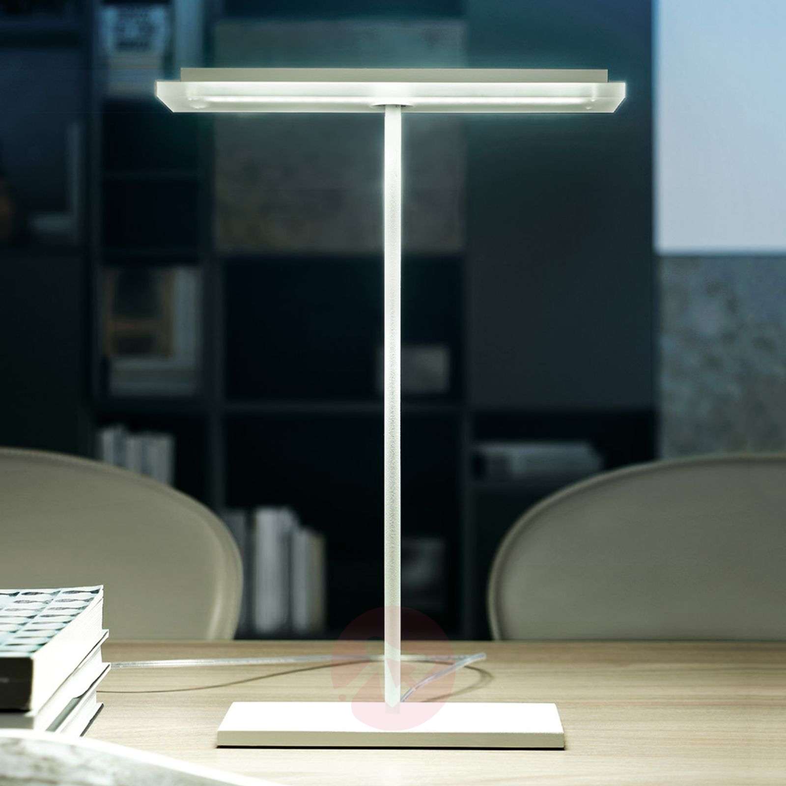 Płaska lampa stołowa Dublight LED w kolorze białym Lampa stołowa LED Dublight LED szczególnie nadaje się do oświetlenia biurka w domowym biurze, ale również zapewnia jasne oświetlenie dodatkowe o barwie ciepłej bieli w nowocześnie urządzonych salonach. Płaski kształt powtarza się we wzornictwie klosza, który składa się również z prostokątnego, płaskiego metalowego elementu i nieco wystającego z niego satynowanego dyfuzora z polimetakrylanu metylu. Metalowe części lampy stołowej Dublight LED zostały pomalowane na biało w technice lakieru termokurczliwego. Przełącznik został zainstalowany w przezroczystym kablu. Klasa efektywności energetycznej: A+