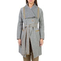 Niezwykle kobiecy model płaszcza damskiego, który pięknie podkreśla talię, dzięki wiązaniu w pasie. Cechą charakterystyczną modelu jest skórzana lamówka, która nadaje mu ciekawy wygląd. Duży, wykładany kołnierz może być doskonałą alternatywą dla różnego rodzaju szali i chust. wykonany z wełny z domieszką poliestru; model zapinany na guzik; posiada 2 otwarte kieszenie zewnętrzne; przybliżona wysokość całkowita wynosi 92 cm.
