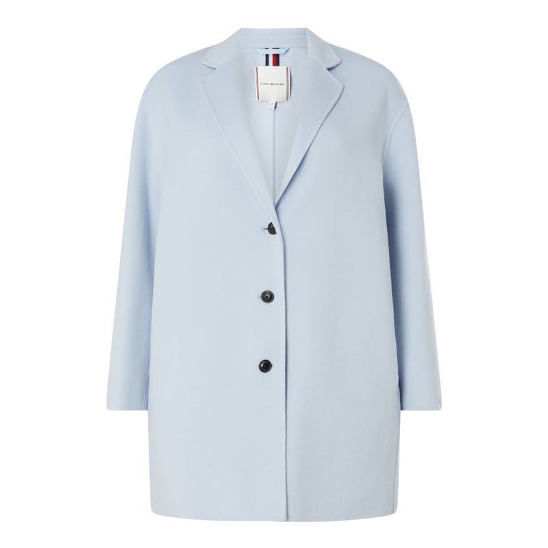 Płaszcz wełniany damski Tommy Hilfiger Curve, Mieszanka wełny, Prosty krój, Kołnierz z połami, Listwa guzikowa, Wpuszczane kieszenie, Lekka podszewka, Długość tyłu w rozmiarze 46: 85,5 cm , Szerokość ramion w rozmiarze 46: 50 cm , Długość rękawa w rozmiarze 46: 58 cm