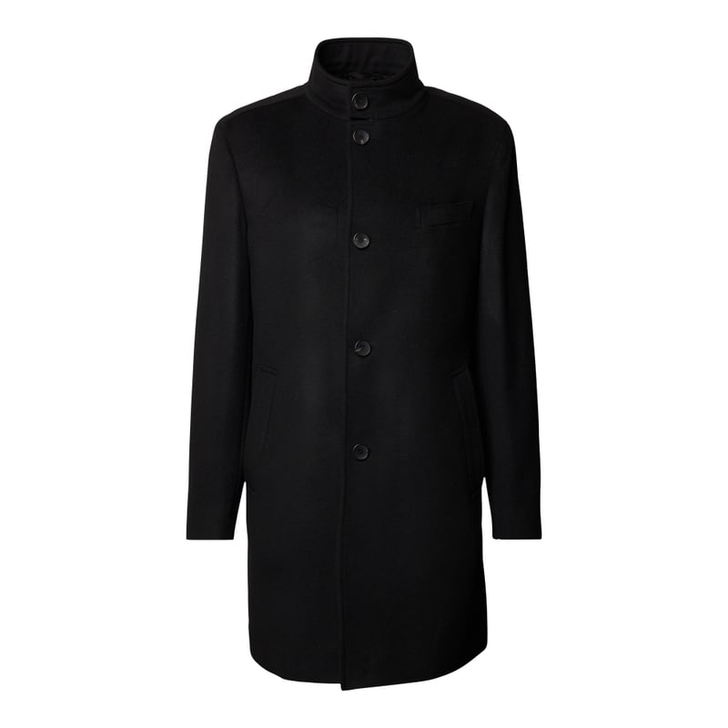Płaszcz wełniany męski BOSS, Mieszanka żywej wełny i kaszmiru, Krój slim fit, Stójka z zapięciem na guzik, Listwa guzikowa, Boczne wpuszczane kieszenie, Brustasza, Kieszeń wewnętrzna, Rozcięcie z tyłu, Długość tyłu w rozmiarze 50: 94 cm, Szerokość ramion w rozmiarze 50: 49 cm, Szerokość klatki piersiowej w rozmiarze 50: 58 cm, Długość rękawa w rozmiarze 50: 67 cm