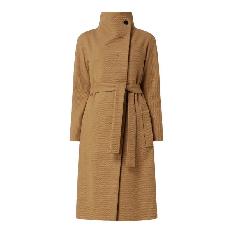 Płaszcz wełniany damski BOSS, Mieszanka żywej wełny z domieszką kaszmiru , Taliowany krój , Tkana faktura , Wykładany kołnierz, Kryta listwa guzikowa , Pasek w talii , Kieszenie z wypustkami , Rozporek, Długość tyłu w rozmiarze 44: 110 cm