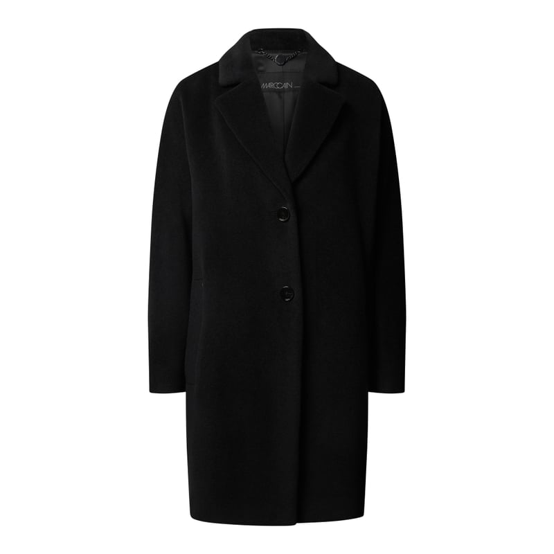 Płaszcz damski Marc Cain, Mieszanka materiałów z dodatkiem wełny i wełny z alpaki, Prosty krój, Kołnierz z połami, Listwa guzikowa, Boczne wpuszczane kieszenie, Długość tyłu w rozmiarze 36: 90 cm, Szerokość ramion w rozmiarze 36: 46 cm, Szerokość klatki piersiowej w rozmiarze 36: 55 cm, Długość rękawa w rozmiarze 36: 57 cm