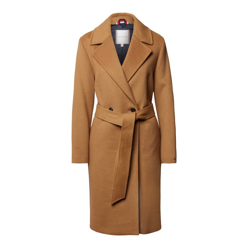 Płaszcz damskia Tommy Hilfiger, Mieszanka materiałów z dodatkiem wełny, Zaznaczona talia, Kołnierz z połami, Zapięcie na guzik, Boczne wpuszczane kieszenie, Pasek w talii, Aplikacja z logo, Długość tyłu w rozmiarze 36: 100 cm, Szerokość ramion w rozmiarze 36: 42 cm, Szerokość klatki piersiowej w rozmiarze 36: 54 cm, Długość rękawa w rozmiarze 36: 60 cm