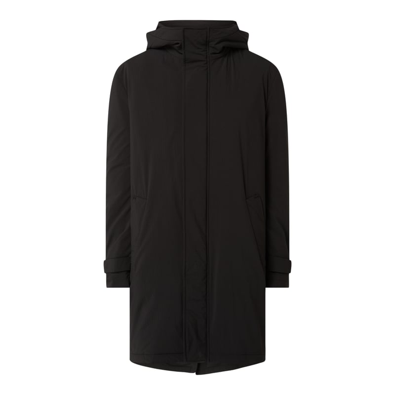 Płaszcz męski DRYKORN , Wytrzymały materiał , Prosty krój , Kaptur , Zamek błyskawiczny z plisą zapinaną na zatrzaski, Rozporek, Watowanie , Długość tyłu w rozmiarze 50: 98 cm, Szerokość ramion w rozmiarze 50: 50 cm, Długość rękawa w rozmiarze 50: 69 cm