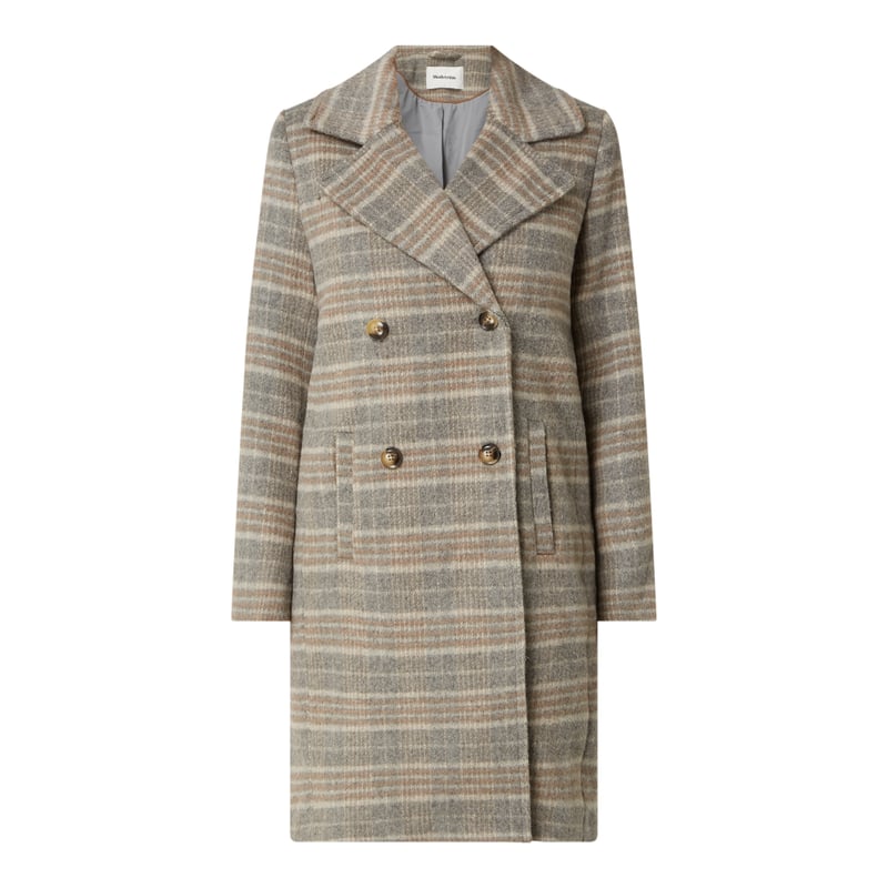 Płaszcz damski Modström, Miękki materiał , Taliowany krój , Tkany wzór , Kołnierz z połami, Listwa guzikowa 2-rzędowa , Kieszenie z wypustkami, Rozporek, Długość tyłu w rozmiarze S: 98 cm , Szerokość ramion w rozmiarze S: 40 cm , Długość rękawa w rozmiarze S: 64 cm