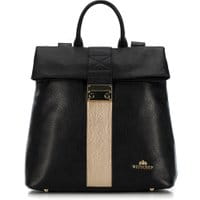 Damski plecak z kolekcjiElegancePlecak damski uszyty w całości z najwyższej jakości skóry naturalnej o groszkowanej fakturze. Model ze składaną klapą zapinaną na ozdobne zapięcie z efektem lustrzanym, dodatkowo urozmaicono kontrastowym, szerokim pasem, który biegnie przez środek przedniej części. Akcesorium dostępne jest w dwóch opcjach kolorystycznych: czarno-złotejoraz brązowo-beżowy.Nasza rada: dla kobiet, który cenią sobie bardziej praktyczną wersję torebek. wykonany znaturalnych skór; całość przykryta klapą zapinaną ma metalowe zapięcie; wewnątrz kieszeń zamykana na suwak, miejsce na telefon komórkowy oraz otwarta kieszeń na drobiazgi; pomieści format A4; z tyłu kieszeń zamykana na suwak; możliwość regulacji długości pasków; podstawa zabezpieczona metalowymi nóżkami.
