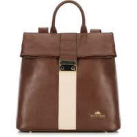 Damski plecak z kolekcjiElegancePlecak damski uszyty w całości z najwyższej jakości skóry naturalnej o groszkowanej fakturze. Model ze składaną klapą zapinaną na ozdobne zapięcie z efektem lustrzanym, dodatkowo urozmaicono kontrastowym, szerokim pasem, który biegnie przez środek przedniej części. Akcesorium dostępne jest w dwóch opcjach kolorystycznych: czarno-złotejoraz brązowo-beżowy.Nasza rada: dla kobiet, który cenią sobie bardziej praktyczną wersję torebek. wykonany znaturalnych skór; całość przykryta klapą zapinaną ma metalowe zapięcie; wewnątrz kieszeń zamykana na suwak, miejsce na telefon komórkowy oraz otwarta kieszeń na drobiazgi; pomieści format A4; z tyłu kieszeń zamykana na suwak; możliwość regulacji długości pasków; podstawa zabezpieczona metalowymi nóżkami.