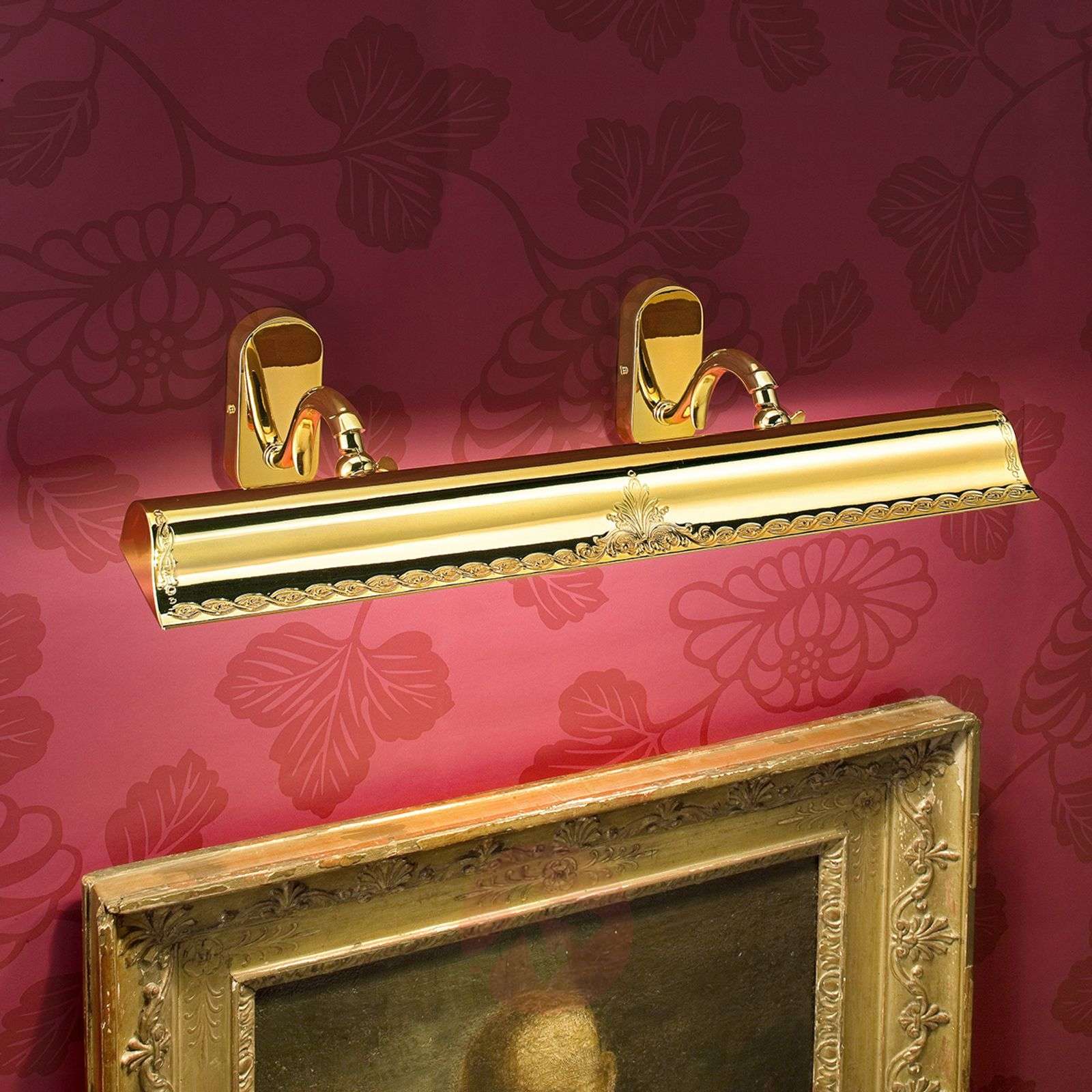 Oświetlenie obrazów Lysanna kieruje wzrok na ścianę Jeśli ktoś pragnie odpowiednio oświetlić obrazy, zdjęcia lub inne przedmioty dekoracyjne, Lysanna z pewnością okaże się właściwym wyborem, bez względu na okazję. Jego klasyczny charakter podkreśla zwłaszcza pozłacany metal; głowica otoczona jest dekoracyjnym obramowaniem, które rzuca ciekawe akcenty. Produkty tego producenta wykonano na terenie UE. Klasa efektywności energetycznej: A++