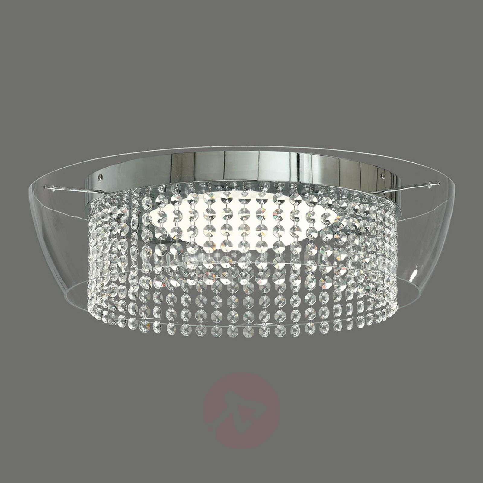 Ital - połyskująca lampa sufitowa LED z kryształami i przezroczystym szklanym kloszem Lampa sufitowa LED Ital tworzy olśniewające efekty świetlne na suficie pomieszczenia, ponieważ światło z diod LED umieszczone za satynowaną pokrywą załamuje się dookoła na przymocowanych do chromowanego pierścienia łańcuchach z płaskich, szlifowanych kryształów i sprawia, że zaczynają migotać. Przezroczysty klosz zewnętrzny ze szkła chroni kryształowe łańcuchy i stanowi uzupełnienie ekstrawaganckiego i niezwykłego wyglądu lampy sufitowej. Dzięki dużej mocy światła diod LED o barwie ciepłej bieli oraz swoim rozmiarom, lampa sufitowa LED Ital bez problemu oświetla również duże pomieszczenia mieszkalne. Klasa efektywności energetycznej: A+
