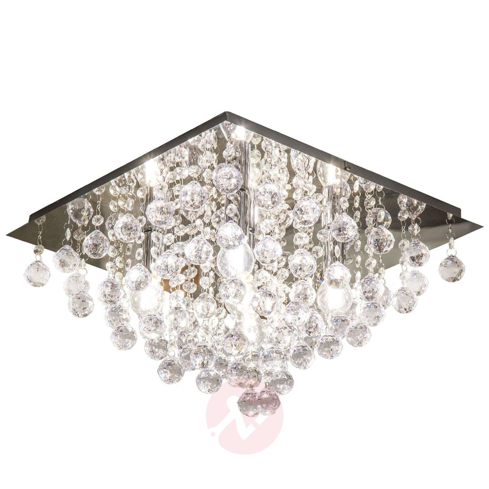 Lampa sufitowa Londyn z połyskującymi szklanymi wisiorami Chromowana podstawa lampy sufitowej Londyn jest kwadratowa, a niezliczone wisiory mają kształt przezroczystych szklanych kropli. Światło pięciu żarówek odbija się w mocowaniu sufitowym, sprawiając, że wisiory zaczynają się mienić. To przepiękne źródło światła, które pasuje do różnych stylów wyposażenia i niezawodnie przykuwa uwagę w każdym pomieszczeniu mieszkalnym. Klasa efektywności energetycznej: A++