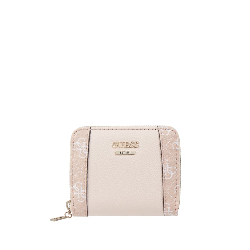 Portfel damski GUESS , Wytrzymały materiał , Wzór z logo , Zapinany na zamek błyskawiczny dookoła, Przegródka na monety z zatrzaskiem, Przegródka na banknoty, Cztery przegródki na karty, Aplikacja z logo , Wysokość: 10 cm, Szerokość: 11 cm, Głębokość: 2 cm