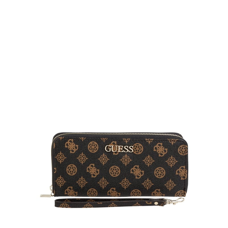 Portfel damski GUESS , Materiał skóropodobny , Wzór z logo , Zapinany na zamek błyskawiczny dookoła , Dwanaście przegródek na karty, Przegródka na monety zapinana na zamek błyskawiczny , Odpinana pętelka, Dwie przegródki na banknoty , Aplikacja z logo , Wysokość: 10,5 cm, Szerokość: 21 cm, Głębokość: 3 cm