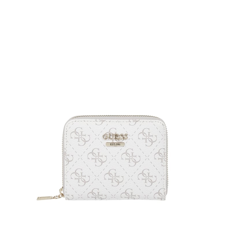 Portfel damski GUESS, Materiał skóropodobny, Wzór z logo, Zapinany na zamek błyskawiczny dookoła, Przegródka na monety z zatrzaskiem , Przegródka na banknoty, Cztery przegródki na karty, Wysokość: 9,5 cm, Szerokość: 11 cm, Głębokość: 2,5 cm