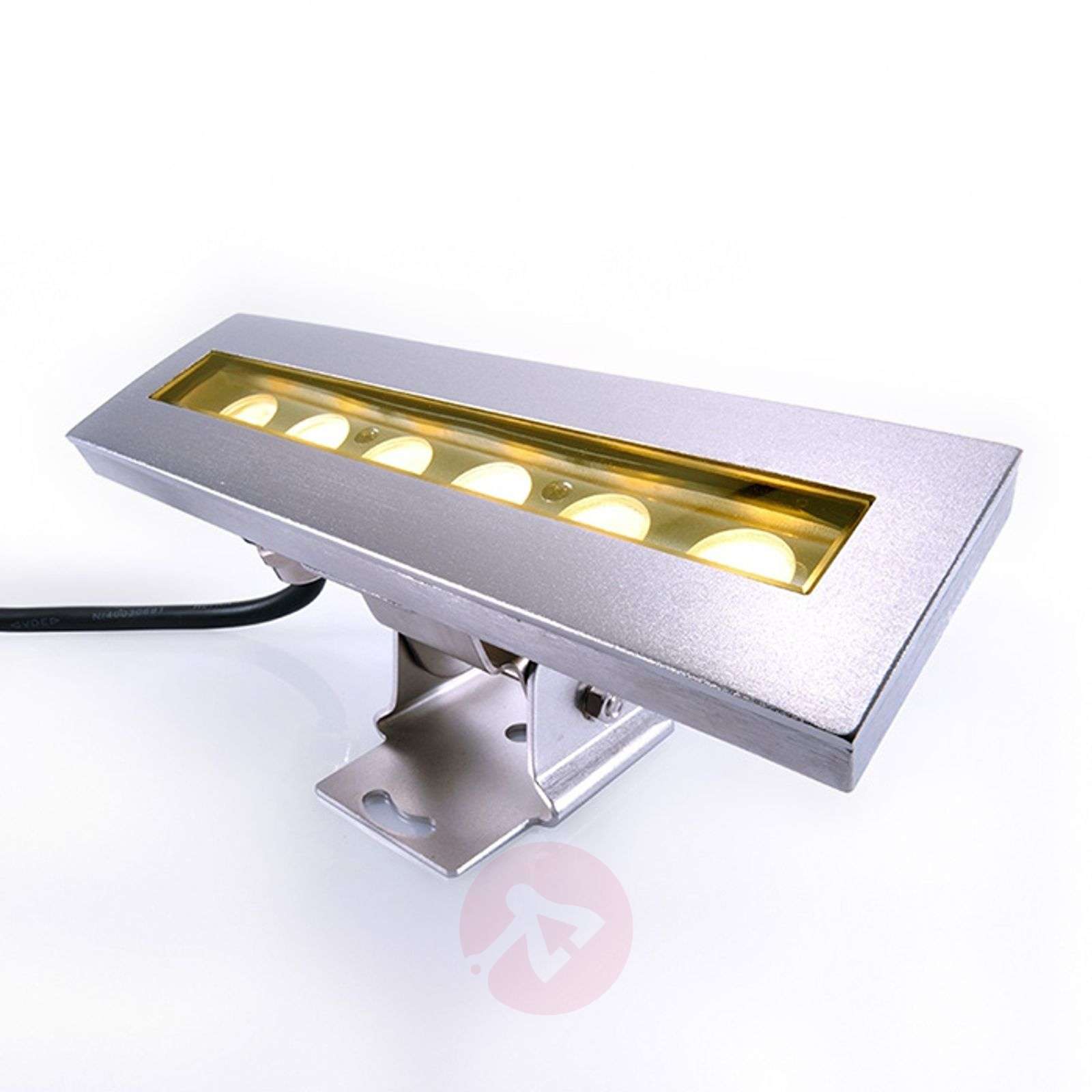 Światło spod wody – Power Spot LED Ten spot LED został zaopatrzony w obudowę ze stali szlachetnej i wyposażony w ciepłobiałe diody LED. Stylowo oświetlają one podwodną część stawu lub przydomowego basenu. W sumie zamontowano tu 6 diod LED o łącznej mocy 12 watów, które wytwarzają strumień świetlny o natężeniu 520 lumenów. Kąt świecenia wynosi 30° i można go w razie potrzeby ustawiać, korzystając z szyny prowadzącej. Lampka podwodna dostarczana jest z kablem przyłączeniowym (10 m). Zasilacz należy zamówić oddzielnie w zakładce „Akcesoria dodatkowe”. Artykuł ten nadaje się wyłącznie do stosowania pod wodą, z zanurzeniem do maksymalnej głębokości jednego metra. Klasa efektywności energetycznej: A+
