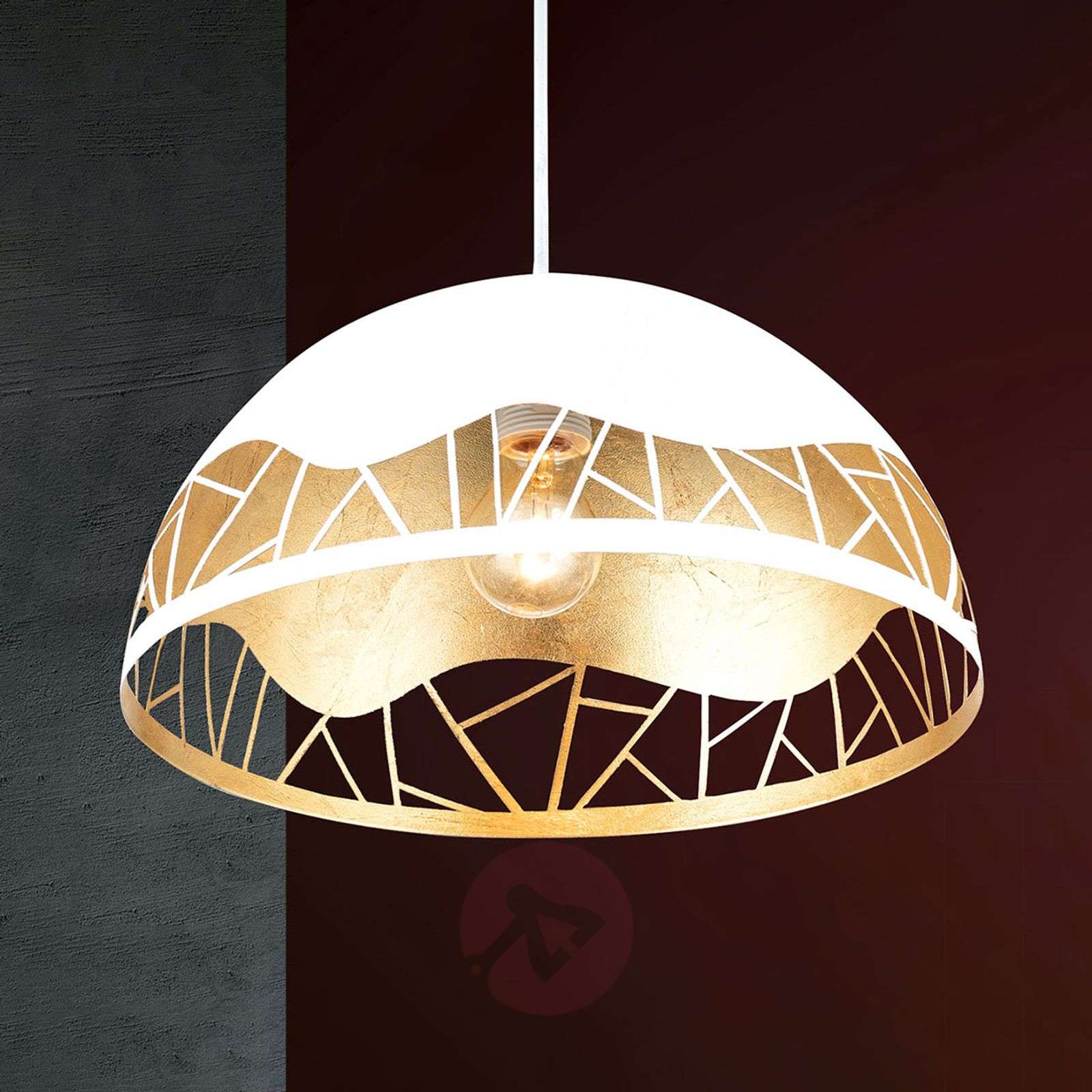Ręcznie wykonana lampa wisząca Trance pokryta złotem płatkowym Lampa wisząca Trance, z kloszem o bardzo ekskluzywnym wyglądzie, została wykonana ręcznie we Włoszech: z klosza, który został pomalowany z zewnątrz na biało, wycięto dekoracyjny wzór przy użyciu technologii cięcia laserowego, wewnątrz klosz wyposażony jest w aplikacje ze złota płatkowego, które wyraziście podkreślają wzór. Powłoka ze złota płatkowego tworzy bardzo specyficzną atmosferę oświetleniową, gdy tylko włączy się światło. Wspaniała lampa wisząca, która znakomicie nadaje się na przykład do bardzo nastrojowego oświetlenia stołu. Klasa efektywności energetycznej: A++