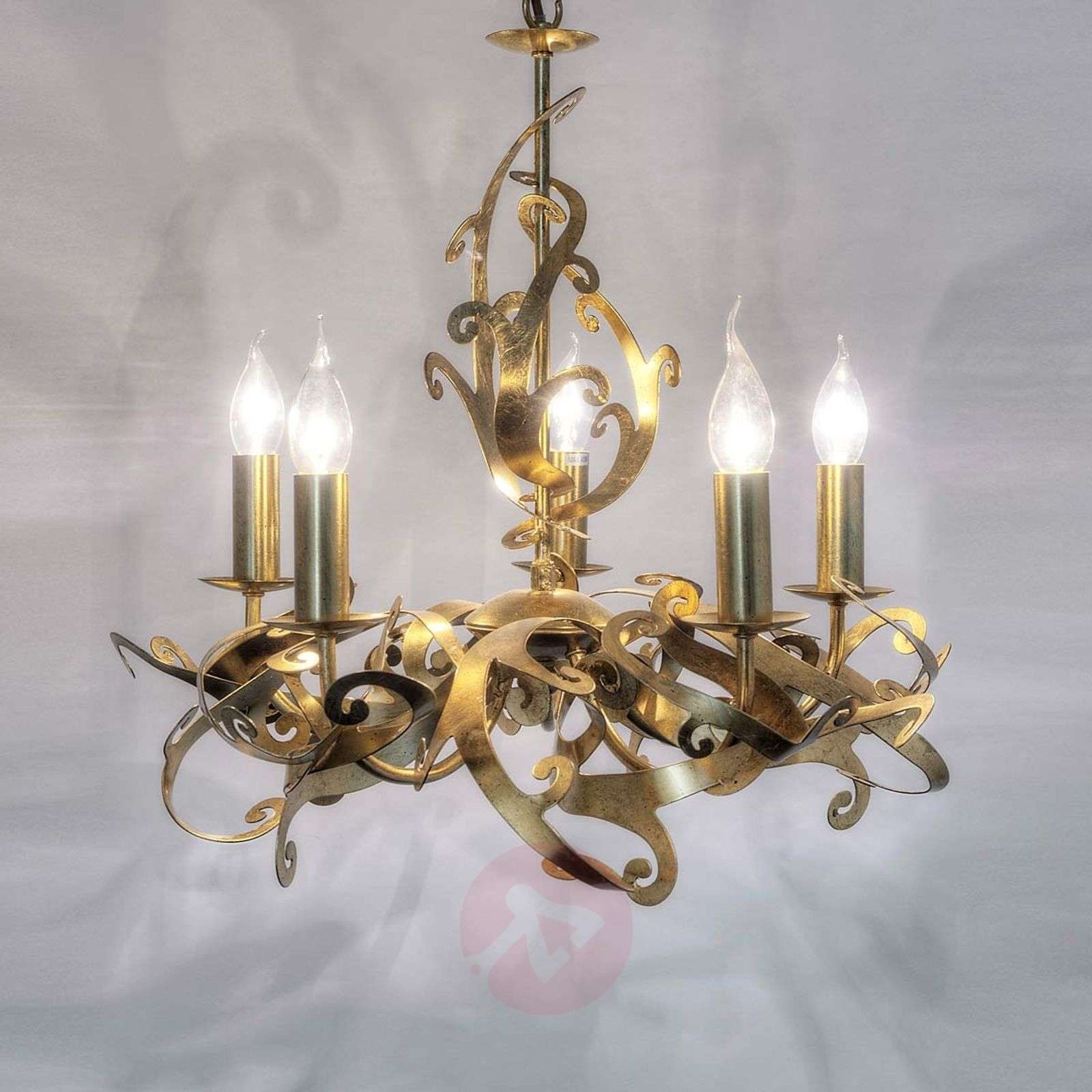 Designerski żyrandol Buono z kosztownym złoceniem Designerski żyrandol Buono wyróżnia się kunsztownie wykończonym szkieletem wykonanym z żelaznych elementów, pokrytych złotem w listkach, połączonych ze sobą w kunsztowny sposób. Na podwieszenie składa żelazny łańcuch z ogniwami - dzięki tej konfiguracji Buono Piccola będzie doskonale pasowała do wnętrz zaaranżowanych z dodatkiem antycznych akcentów. Światło pięciu świecowych żarówek sprawi, że pokryta złotem powierzchnia będzie się mieniła i lśniła. Klasa efektywności energetycznej: A++