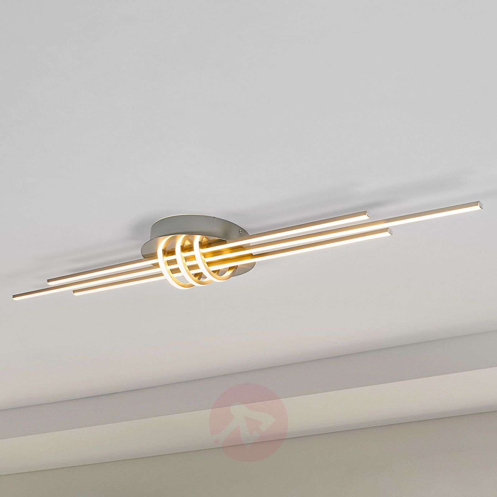 Lampa sufitowa LED Leart z trzema długimi świecącymi profilami Leart to lampa sufitowa z metalową podstawą z satynowanego niklu, która nadaje przestrzeni mieszkalnej bardzo nowoczesny wygląd. Taśmy LED rozświetlają pomieszczenie jasnym światłem o barwie ciepłej bieli, a zamiast klosza pod sufitem znajdują się trzy wąskie profile, które na wysokości mocowania sufitowego uzupełniają dodatkowo trzy świecące łuki. Modne wzornictwo i nowoczesna technologia do współczesnych stylów wyposażenia wnętrz! Klasa efektywności energetycznej: A+