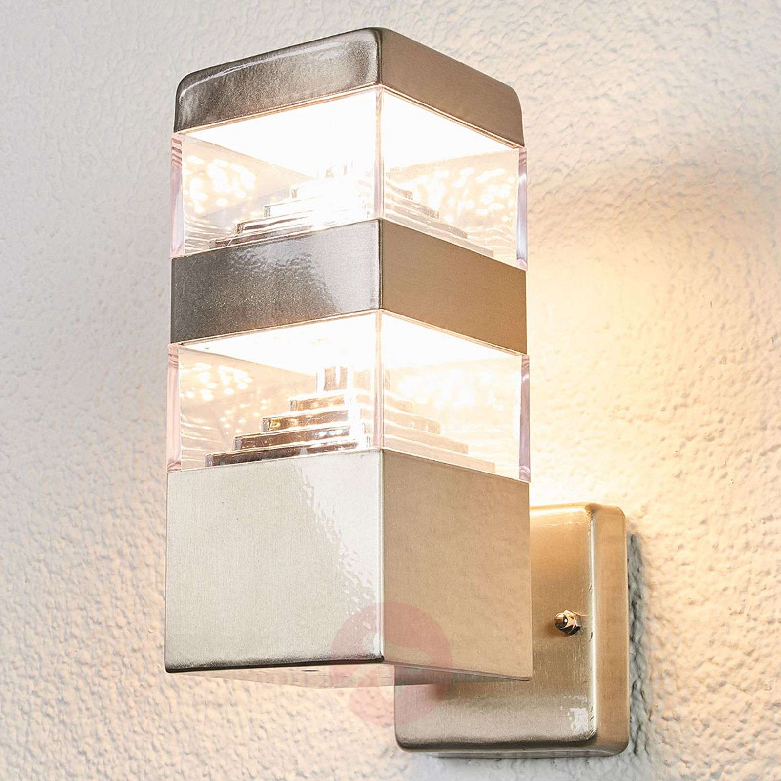 Kwadratowy kinkiet LED Sinja, IP44 Lampa Sinja jest przeznaczona do użytku na zewnątrz. Wykonana głównie ze stali szlachetnej wygląda bardzo nowocześnie. Akcentem przełamującym strukturę stali szlachetnej są dwie przezroczyste osłony z tworzywa sztucznego, przez które widać reflektory o geometrii stożkowej. Efektownie eksponują one refleksy światła. Klasa efektywności energetycznej: A+