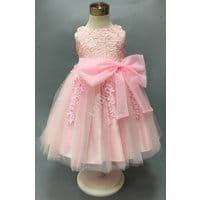 Jasnoróżowa sukienka dziecięca z gipiurową koronką i obszernym dołem.