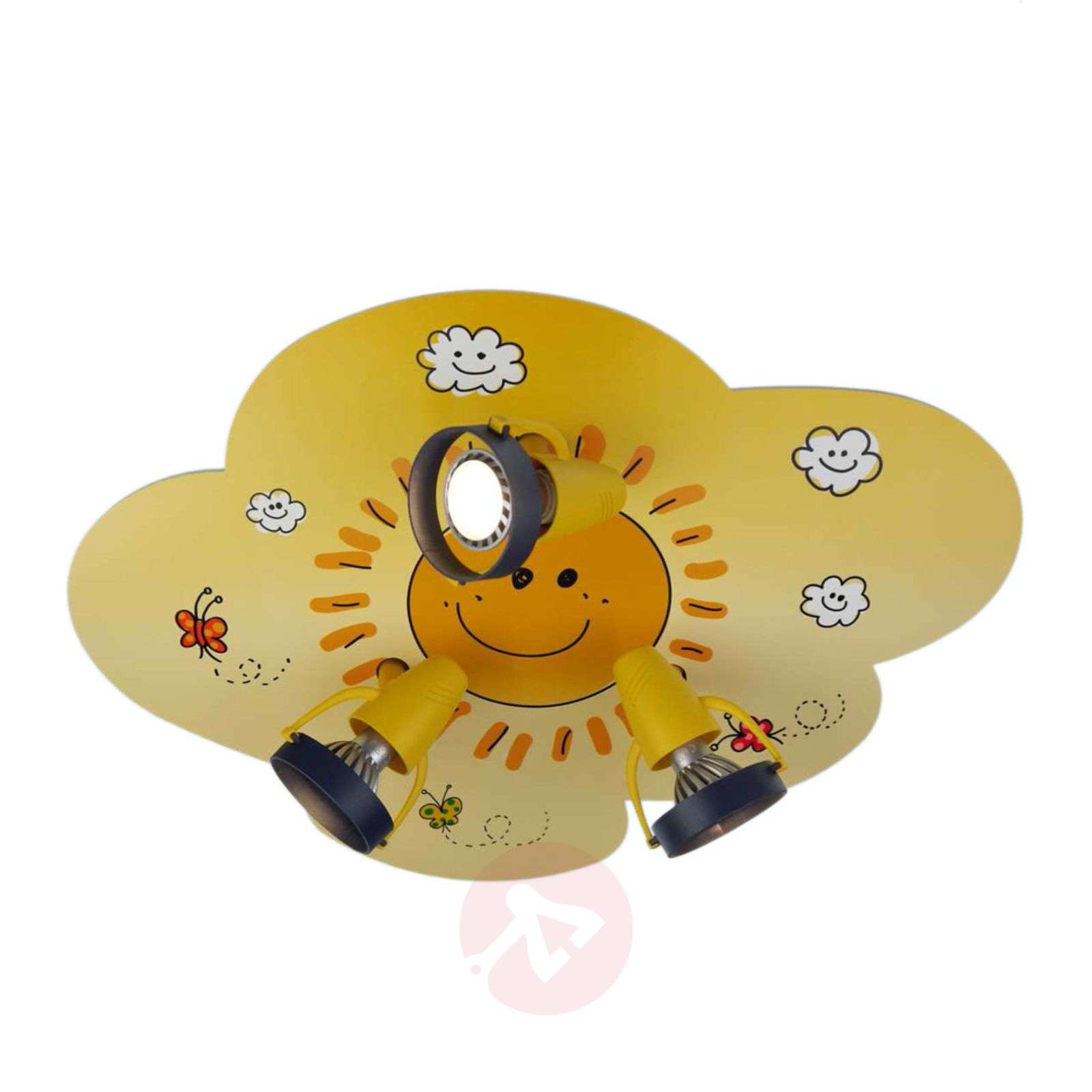 Żółta lampa sufitowa Sunny z 3 spotami Na środku płyty sufitowej z MDF w kształcie chmury błyszczy słońce, które rozweseli wnętrze dziecięcego pokoju również podczas pochmurnych dni. Obracane i odchylane reflektory można indywidualnie ustawiać i kierować światło tam, gdzie jest ono w danej chwili potrzebne. Klasa efektywności energetycznej: A++