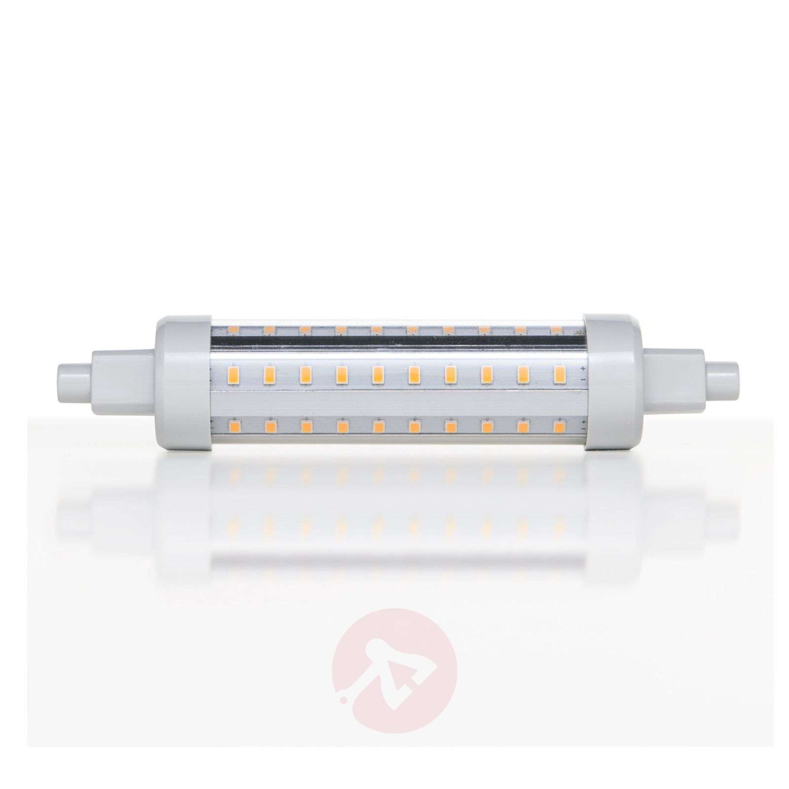 R7s 10W żarówka LED rurkowa E27 z jasnym światłem 950 lm Ta żarowka LED zapewnia odpowiednią jasność w pomieszczeniu , emitując światło na dużej powierzchni pod kątem oświetlenia 330°. Światło ciepłe białe oraz wysoki wskaźnik oddawania barw (RA80) zapewniają, że kolory są naturalne i niezakłamane, co jest z pewnością dodatkowym atutem tej żarówki LED. Właściwości: - bardzo duża oszczędność energii (EEK A+) - czas świecenia żarówki wynosi maks. 10 000 godzin - bez możliwości ściemniania Klasa efektywności energetycznej: A+