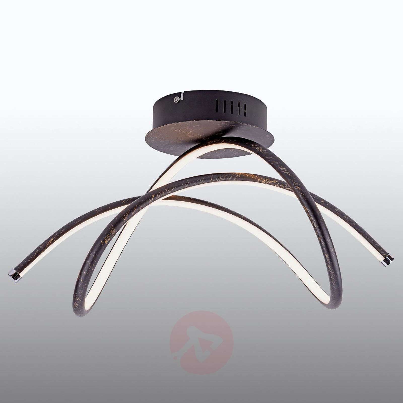 Rdzawa lampa sufitowa LED Violetta To lampa sufitowa o unikalnej formie, której diody LED umieszczone wewnątrz wygiętych łuków oświetlają pomieszczenie od góry. Nowoczesne źródło światła jest wbudowane w metalowym elemencie w kolorze rdzy, który przeplata się jak luźna lina. Lampa stanowi atrakcję wizualną z każdej perspektywy. Ekstrawagancka, a mimo to pozbawiona patosu lampa z rdzawego metalu łączy lekkość i dynamikę z rustykalnym charakterem i stabilnością. Takie źródło światła doskonale pasuje do pomieszczeń urządzonych w nowoczesnym i minimalistycznym stylu, a także wnętrz industrialnych. Lampa oświetla pomieszczenie zamocowana do okrągłego zawieszenia sufitowego w kolorze rdzy, pod którym wydaje się unosić. Klasa efektywności energetycznej: A+