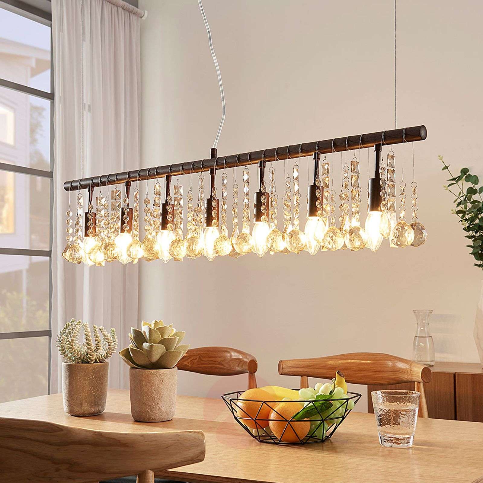 7-punktowa lampa wisząca Matei z rdzawym stelażem i ozdobami w kolorze bursztynowym Połączenie kolorów rdzy i bursztynu sprawia, że ta lampa wisząca Matei staje się lampą zapewniającą ciepłą atmosferę. Jej 7-punktowa wersja bardzo dobrze nadaje się do zamontowania nad stołem w jadalni lub nad ladą. Szlifowane ozdoby zwisają z drążka na łańcuszkach i mają kolor bursztynu, dzięki czemu powstają piękne i ciepłe refleksy świetlne, postrzegane jako iskrzenie się i błyski. Klasa efektywności energetycznej: A++