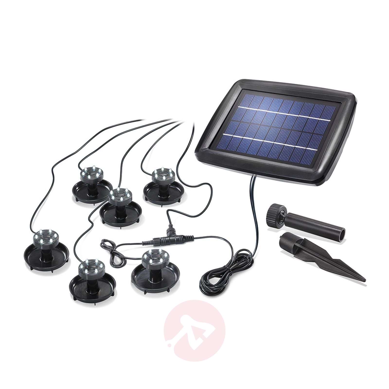 Solarny reflektor LED Super Splash zapewni efektowne oświetlenie podwodne. Gdy zapadnie zmrok, pięknie rozświetli staw w ogrodzie. Na dnie stawu, względnie w strumieniu lub w strefie brzegowej, umieszcza się sześć małych kręgów świetlnych i łączy je ze sobą za pomocą złącz T-kształtnych , a także, za pomocą śrub, z modułem solarnym. Instalacja jest wodoszczelna. Krystaliczny moduł solarny o dużej mocy można wetknąć za pomocą grota ziemnego w glebę obok stawu, gdzie w ciągu dnia będzie naładowywać akumulator energią słoneczną. Gdy tylko zapadnie zmrok, zapali się sześć reflektorów, pięknie oświetlając ogrodowy staw. – moduł solarny: 2,2 Wp – maks. czas świecenia po pełnym naładowaniu akumulatorów: ok. 8 godzin – akumulatory: 5 szt. Mignon NiMh 1,2V/1500 mAh – długość kabla, złącze T-kształtne: 1,5 m – długość kabla, krąg świetlny: 85 cm Klasa efektywności energetycznej: A+