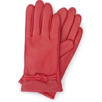Ocieplane rękawiczki damskie, wykonane z najwyższej jakości skóry owczej. Na pozór minimalistyczny design prezentuje się niezwykle elegancko i kobieco. Na wysokości nadgarstka wszyto ozdobny rzemyk zawiązany w szykowny supełek. Zestawienie gładkiej faktury z perforacjami nadaje klasycznym rękawiczkom nowoczesnego charakteru. Rękawiczki dostępne w dwóch modnych kolorach: czerwonym oraz czarnym. wykonane z najwyższej jakości skóry licowej; wnętrze ocieplone polarem zapewnia dobrą ochronę przed chłodem i mrozem. Rozmiar V S M L XL Długość (cm) 21,5 22 22,5 23 23,5 Szerokość (cm) 8,5 9 9,5 10 10,5 Długość śr. palca (cm) 8 8,5 9 9,5 10