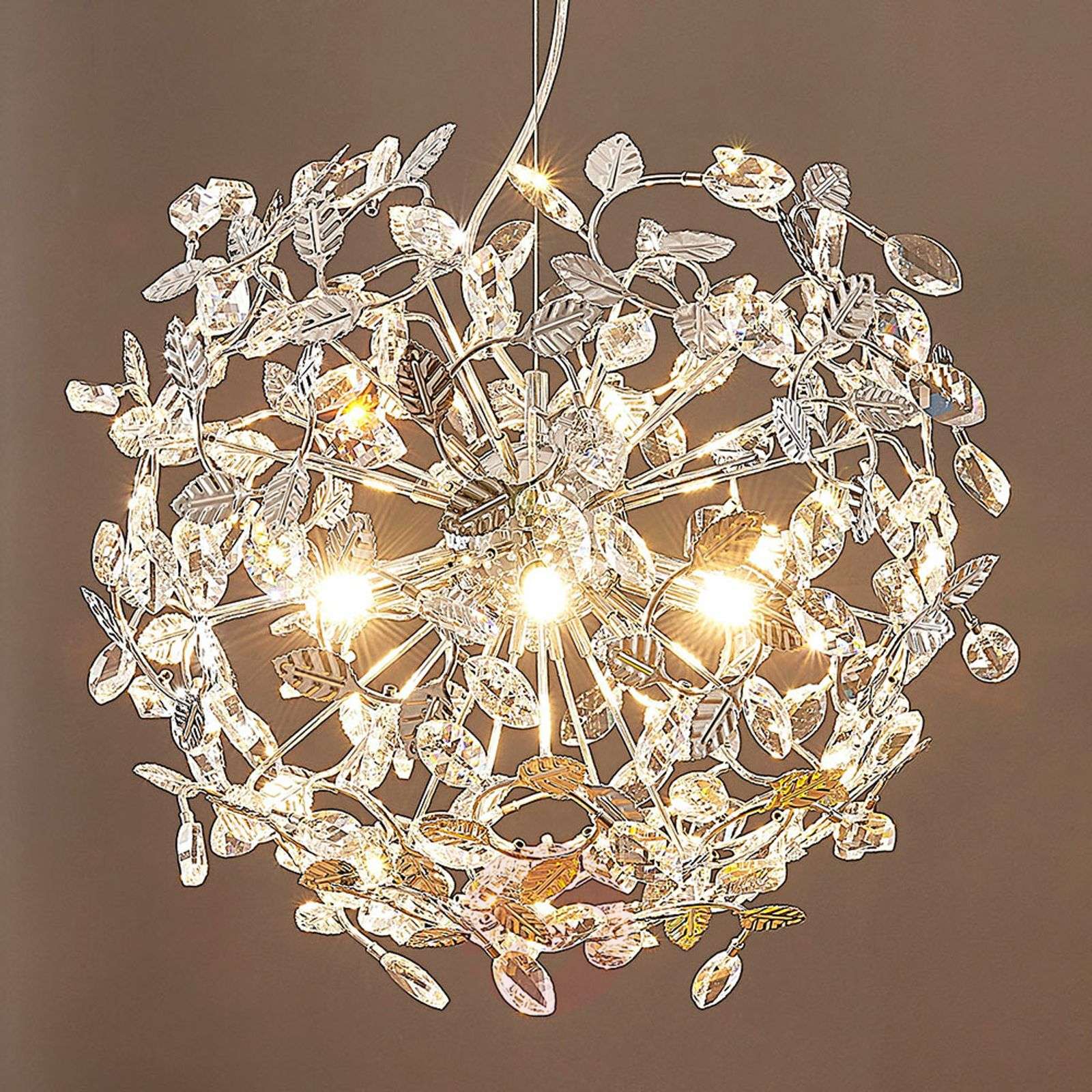 Iskrzące się światło: lampa wisząca Bjarne z lśniącymi kryształami i chromowanymi płatkami metalu Bez wątpienia wygląd i efekt świetlny, wywołany przez tę lampę wiszącą, wysuwa się na pierwszy plan. Sama zaś subtelna lampa z pewnością wygląda dzięki temu inaczej. Okrągły klosz składa się z błyszczących chromowanych elementów metalowych w formie liści i licznych kryształów K9, które są szlifowane na wiele różnych sposobów, tak aby miały wiele narożników i krawędzi i skutecznie odbijały światło żarówek G9, które przydaje całości blasku luksusu. Lampa wisząca Bjarne jest więc wspaniałą lampą do niezliczonych pomieszczeń mieszkalnych. Jednocześnie można sobie wyobrazić tę oprawę oświetleniową w hotelu i restauracji, gdzie sprytnie wzbogaca stylową atmosferę i zaprasza gości do pobytu oraz sprawia, że będą się tam czuć dobrze. Klasa efektywności energetycznej: A++