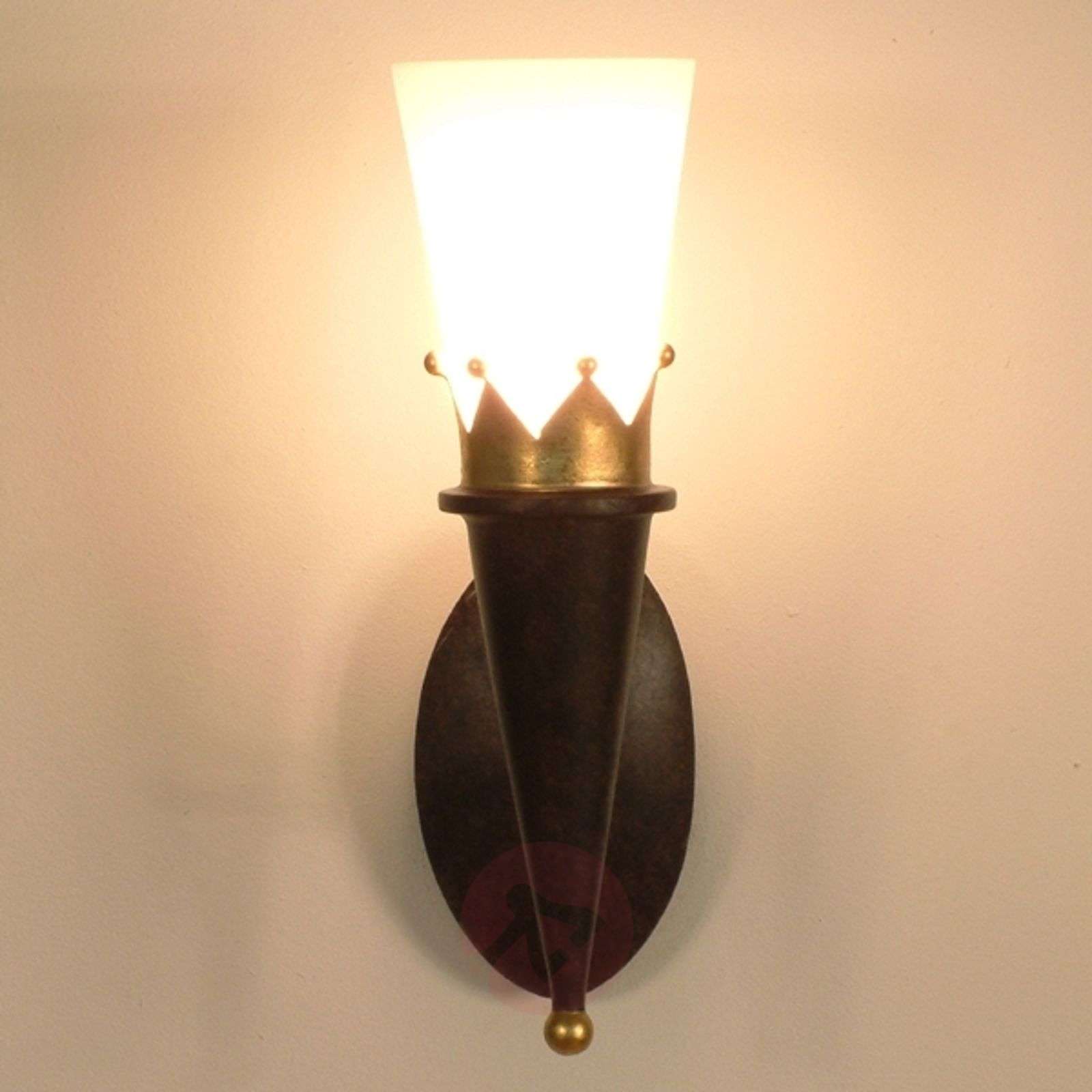 Stylowa lampa ścienna CORONA z królewskim zdobieniem Piękna lampa ścienne CORONA dzięki swoim zdobieniom jest godna króla. W klasycznym kształcie pochodni jest połączeniem brązowego metalu z białym szkłem. Szlachetny wygląd lampy zapewniają małe korony, które nadają tej lampie to szczególne Coś. Piękny obiekt przyciągający wzrok! Klasa efektywności energetycznej: A++