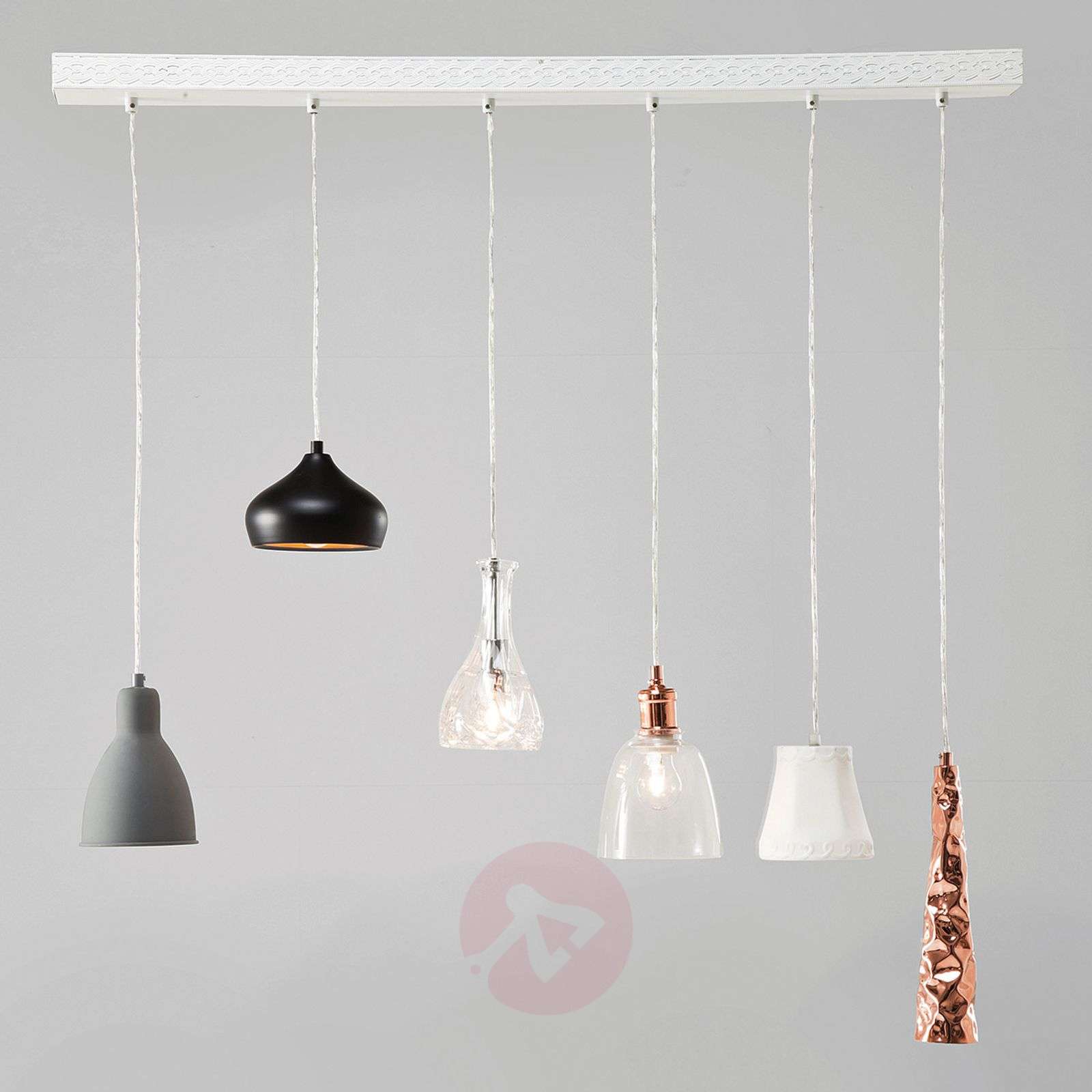 Niezwykła lampa wisząca SHADES DINING, 6-pkt. Lampa wisząca SHADES DINING zachwyca wyjątkową kolorystyką oraz formą. Swój niecodzienny wygląd lampa zawdzięcza również kloszom, które przyjmują raz pękaty, raz płaski a innym razem prostokątny kształt. Ze względu na podłużny baldachim, na którym zamocowane są poszczególne lampy, SHADES DINING doskonale sprawdzi się jako oświetlenie stołu w jadalni. Klasa efektywności energetycznej: A++