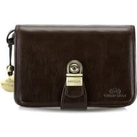 Saszetka z kolekcji Italy Elegancka, skórzana saszetka wykonana ze skóry cielęcej, z widocznymi jarzmowaniami, które dodają jej szyku. Kompaktowy, ale pojemny model, trafi w gust osoby szukających praltycznych rozwiązań zamkniętych w stylowej formie. 2 komory; 1 kieszeń zamykana na suwak; 11 miejsc na karty kredytowe; kieszeń na drobiazgi, zamykana na zatrzask; 4 kieszenie, w tym 1 przezroczysta; miejsce na telefon komórkowy; wysuwany skórzany uchwyt; zamek na klucz.