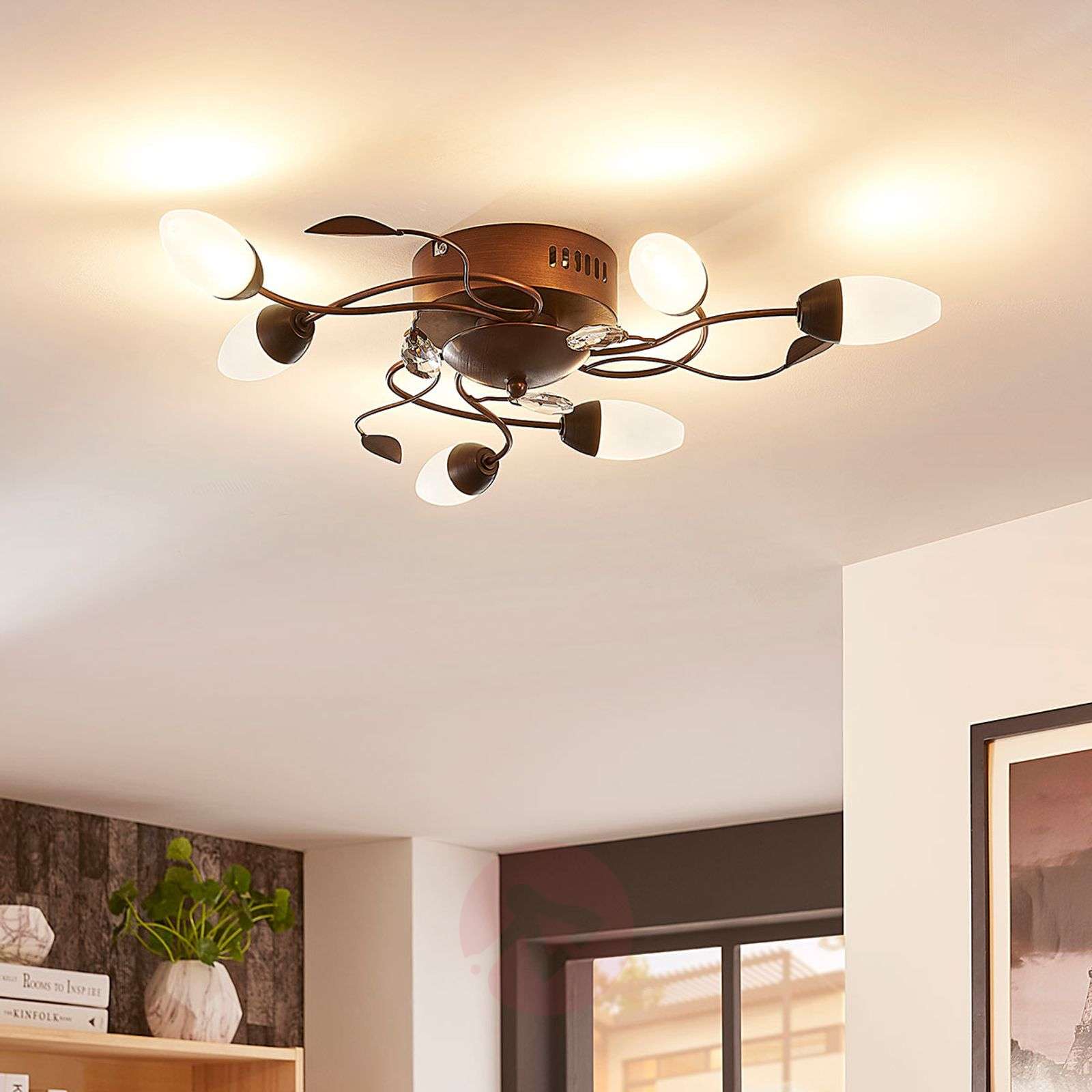 Rdzawobrązowa lampa sufitowa LED Renato z sześcioma białymi szklanymi kloszami, przyciemnianymi przełącznikiem ściennym Renato jest idealnym rozwiązaniem dla tych stylów aranżacji wnętrz, które są bardziej rustykalne, ponieważ ta 6-punktowa lampa sufitowa LED ma rdzawobrązową metalową podstawę z błyszczącymi szklanymi kamieniami. Dzięki sześciu źródłom światła LED Renato jest lampą sufitową o dużej jasności i dobrej efektywności energetycznej. Jeśli jasność będzie kiedykolwiek postrzegana jako zbyt duża, można dokonać trzystopniowej regulacji dzięki technologii ściemniania, zamontowanej w lampie. Trzeba mieć jedynie zwykły przełącznik ścienny. Klasa efektywności energetycznej: A+
