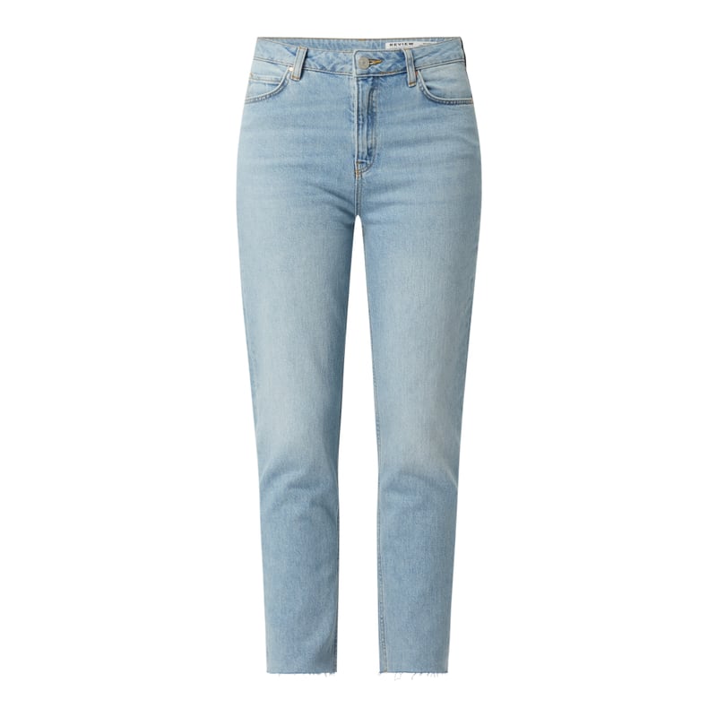 Jeansy damskie REVIEW , Mieszanka bawełny i elastanu , Krój krótki , Prosta nogawka, Zapięcie na guzik i zamek błyskawiczny , 5 kieszeni , Niewykończone brzegi nogawek , Naszywka z logo w pasie , Długość wewnętrzna nogawki w rozmiarze 27/LO: 65 cm, Szerokość w pasie w rozmiarze 27/LO: 74 cm