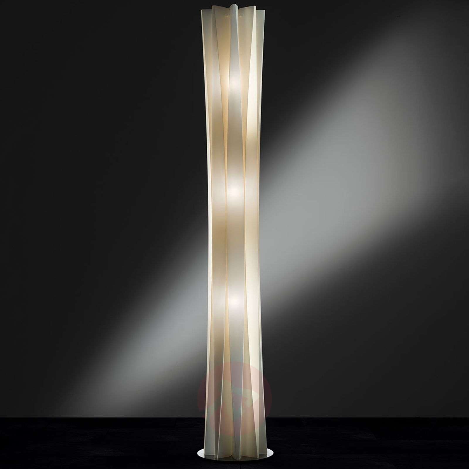 Lampa podłogowa BACH z atrakcyjnymi fałdkami Piękna lampa podłogowa BACH wykonana z doskonałej jakości tworzywa sztucznego ma szlachetny wygląd i opatrzona jest wieloma fałdami, przez co wygląda jak składana, a tym samym bardziej elegancka. Forma przekonuje ponadczasową elegancją, dzięki czemu lampa odnajdzie się w każdym wnętrzu. Wizjonerskie lampy tworzone przez designerów we Włoszech - Slamp Włoska kuźnia designerów Slamp z siedzibą w Rzymie została założona na początku lat 90. XX wieku. przez Roberto Zilianiego. Ziliani już wcześniej działał twórczo zanim odkrył swoją pasję i możliwości, jaki daje światło. Spełniające najwyższe standardy materiały, wykonanie i jakość Marka Slamp kładzie szczególny nacisk na tworzenie nowych materiałów. Oprócz naturalnych i tradycyjnych surowców takich jak skóra, miedź, kryształ czy stal szlachetna firma Slamp wykorzystuje również własne opatentowane materiały jak Cristalflex®, Opalflex® i Lentiflex®. Dzięki nim możliwe jest stworzenie wyjątkowych efektów świetlnych. Na przykład materiał Lentiflex® służy jako woda, która w zależności od kąta patrzenia zmienia kolor. To właśnie własne materiały marki Slamp oraz powstałe z nich lampy są silnymi atutami firmy. Należą do nich również między innymi spory poziom innowacji, kreatywności oraz oryginalności, a także doskonałe wyczucie działania światła. Klasa efektywności energetycznej: A++
