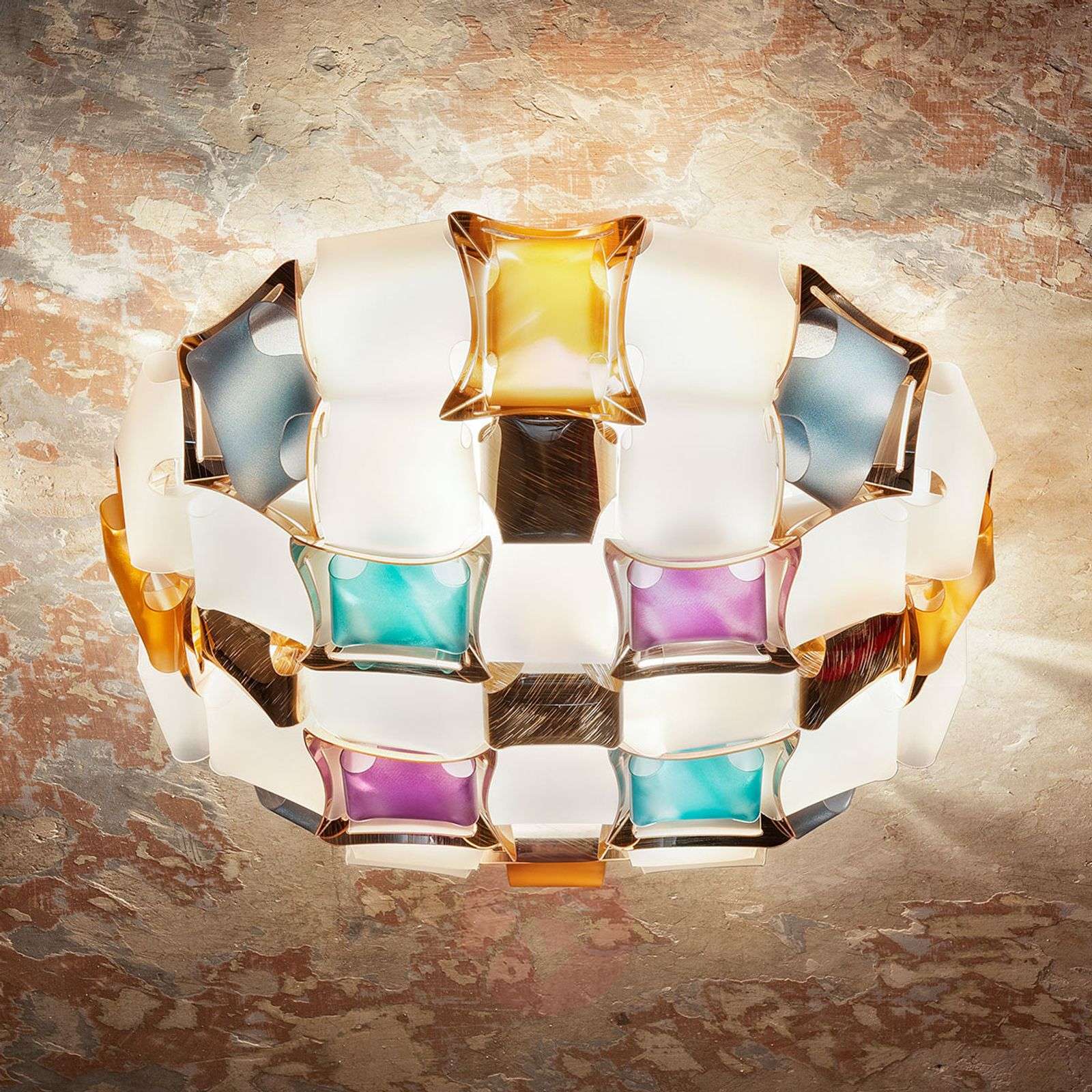 Mida - ręczniewytwarzana designerska lampa sufitowa dla szlachetnych wnętrz Wzornictwo lampy sufitowej Mida zostało stworzone przez młodego projektanta Adriano Rachele, który nadał swoim lampom nutę poezji i emocji. Dzięki miękkim, zakrzywionym kształtom, udało mu się stworzyć unikalne prace, które podkreślają styl marki Slamp i ukazują rzemieślniczy aspekt. Obiekty Rachelego powinny łączyć technologię, funkcjonalność i innowacyjność z tradycją i ironicznym charakterem. Lampa Mida prezentuje przede wszystkim szlachetny i efektowny wygląd, przypominający wysokiej jakości kamienie szlachetne o różnych strukturach powierzchni. Imitacje kamieni szlachetnych z białego Opalflex® i z nadrukiem z Lentiflex® zostały w całości wykonane ręcznie i są umocowane w uchwytach magnetycznych. Przekonują one specjalnym cieniowaniem i efektem jedwabiu. Wszystkie elementy łączą się w kwiat w jaskrawych, opalizujących kolorach. Po włączeniu, trzy żarówki E27 tworzą wspaniałe efekty świetlne na suficie lub ścianie i nadają pomieszczeniu blask. Założona w 1992 roku przez Roberto Zilianiego, włoska firma zajmująca się produkcja lamp Slamp ugruntowała swoją pozycję jako producent wysokiej jakości lamp designerskich. Made in Italy. Klasa efektywności energetycznej: A++