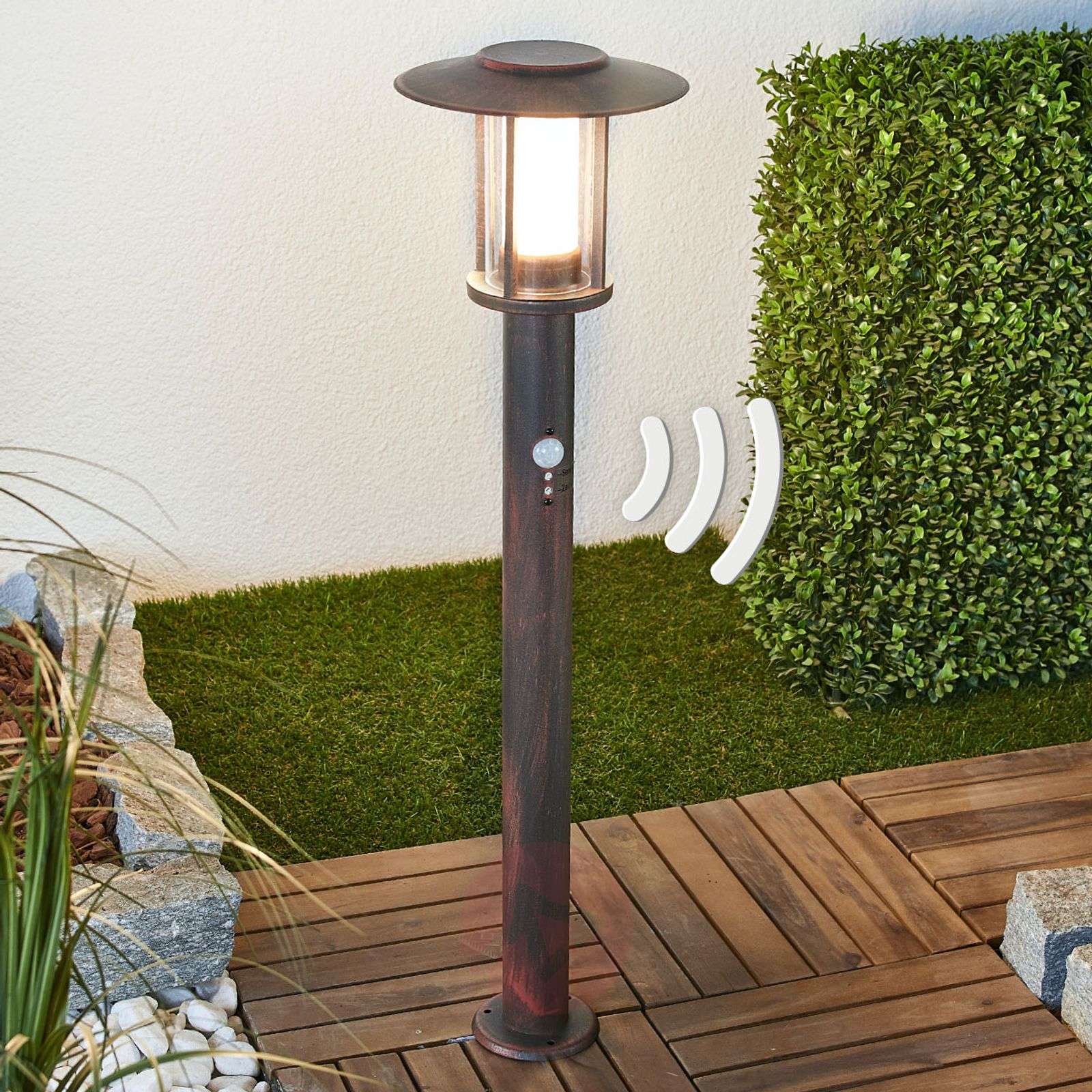 Do oświetlenia kierunkowego na dziedzińcu i w ogrodzie: słupek oświetleniowy LED Pavlos z czujnikiem Zaletą lampy Pavlos jest zintegrowany w podstawie czujnik ruchu. Czujnik ma zasięg od 5 do 7 metrów, wykrywa ruchy w polu 90 stopni, a czas świecenia lampy można ustawić indywidualnie (od 10 sekund do 4 minut). Specyficzna forma i wykończenie powierzchni w kolorze rdzawego brązu sprawiają, że słupek oświetleniowy LED wygląda nieco rustykalnie, dlatego można go z powodzeniem montować w otoczeniu rustykalnych budynków, gdzie zapewnia bardzo dobre, a dzięki diodom LED również energooszczędne oświetlenie. Klasa efektywności energetycznej: A+