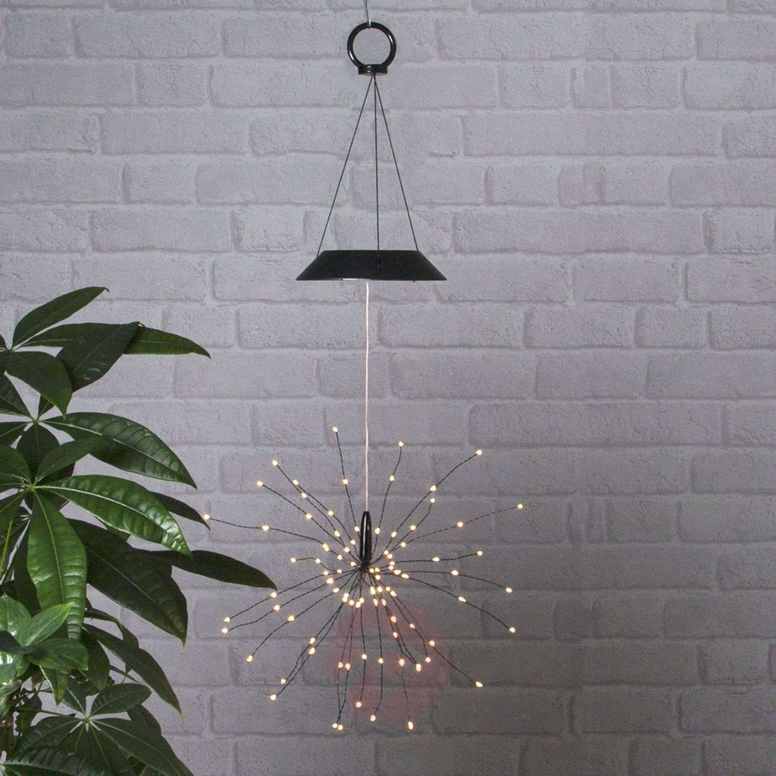 Dekoracyjna lampa solarna LED Firework do ogrodu Jak sama nazwa wskazuje, klosz lampy solarnej LED Firework przypomina imponujący pokaz fajerwerków rozświetlających nocne niebo. Diody LED są zasilane przez akumulator, który jest dostarczany w zestawie. W świetle dziennym akumulator jest ładowany przez moduł solarny. Gdy jasność spada, zintegrowany czujnik zmierzchu włącza diody LED i dba o ich ponowne wyłączenie rano. Dekoracyjna lampa przyciągnie spojrzenia w letnim ogrodzie.