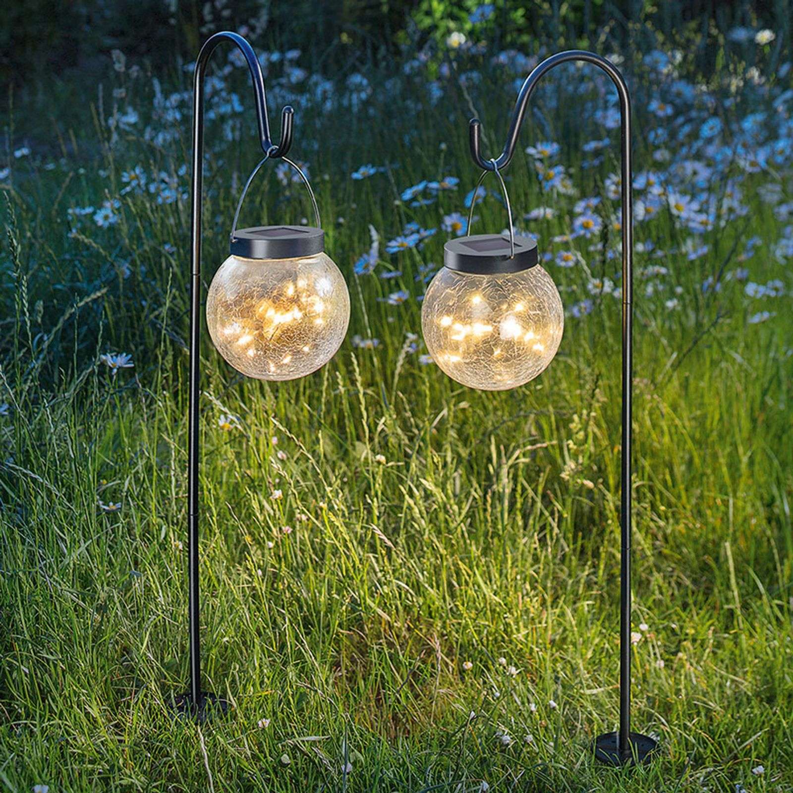 Zestaw 2 szt. solarnego oświetlenia dekoracyjnego Smart Globe z grotami ziemnymi Dwuczęściowy zestaw lamp solarnych Smart Globe to urzekające oświetlenie dekoracyjne grządek. Świecące kule z modułem solarnym w pokrywie są zawieszone na haku na wysokich grotach ziemnych, dzięki czemu są optymalnie wystawione na działanie słońca w ciągu dnia i akumulator może się ładować. W kuli o wyglądzie przeźroczystej stłuczki znajduje się 20 diod LED o barwie ciepłej bieli, zamontowanych na cienkim drucie. Gdy tylko zapada zmrok, czujniki zmierzchu zainstalowane w lampach automatycznie włączają światło. Przy całkowicie naładowanym akumulatorze maksymalny czas świecenia wynosi ok. 6 godzin. - zestaw składający się z 2 lamp - zintegrowane czujniki zmierzchu - barwa światła: ciepła biel (3 000 K) - akumulator NiMh 1,2V/600mAh
