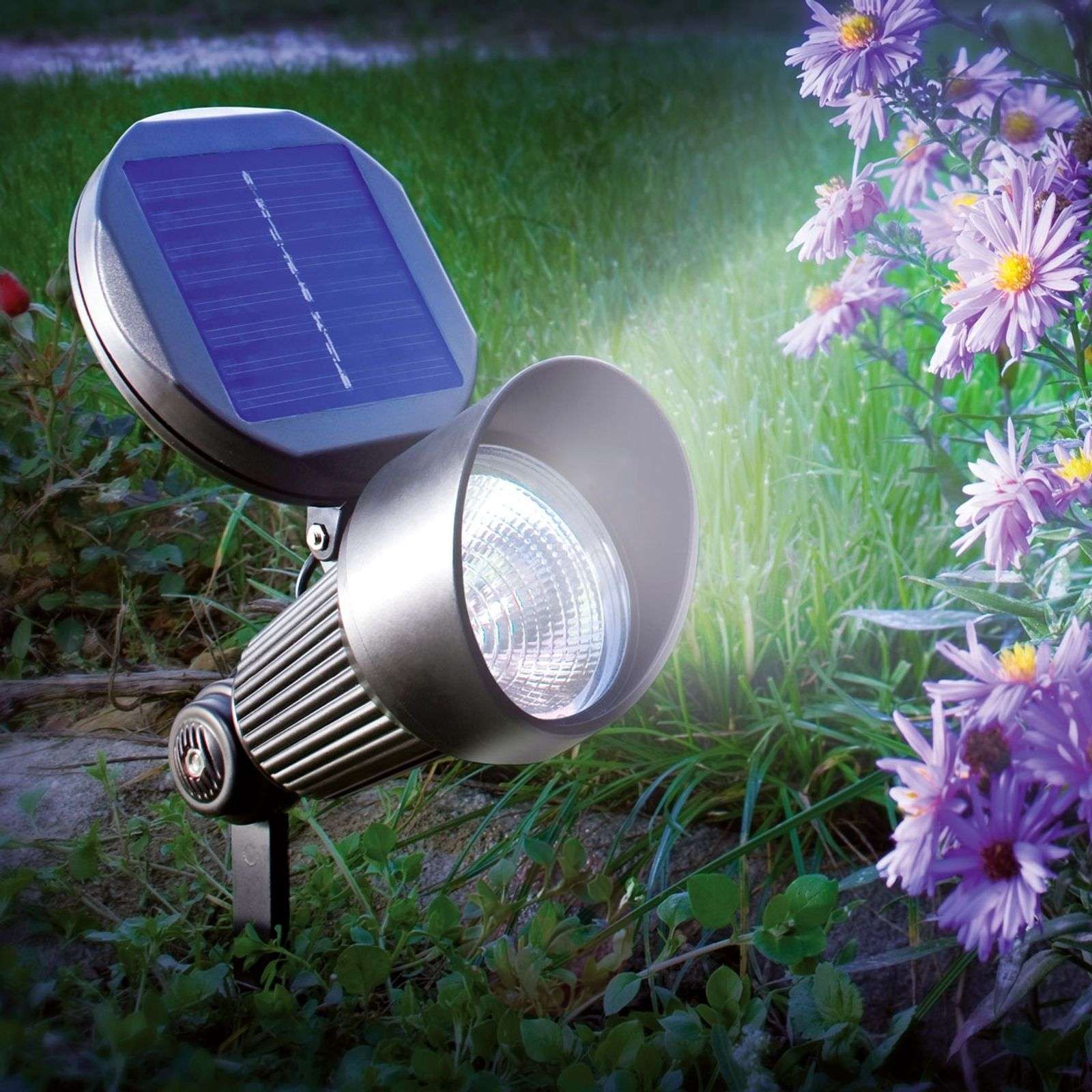 Solarny reflektor ścienny i podłogowy Spotlight Przeznaczona do efektownego oświetlenia krzewów, zarośli, ujść wodnych oraz obiektów znajdujących się w ogrodzie. Stabilna obudowa aluminiowa z palikiem do montażu podłogowego lub zamocowania na ścianie. Krystaliczny moduł solarny o wysokiej mocy zapewnia optymalne ładowanie wbudowanego akumulatora, a 3 superjasne diody LED gwarantują jasne oświetlenie. Lampa włącza się automatycznie o zmierzchu oraz wyłącza o świcie. Dane techniczne: - Maks. czas świecenia przy pełnych akumulatorach: 8 godz. - Obudowa z aluminium do montażu ściennego oraz podłogowego - 3 superjasne diody LED - Krystaliczny moduł solarny - Akumulator: (2 szt.) NiMh 1,2 V/ 900 mAh - Masa 590 g Zakres zastosowania: całorocznie w obszarze zewnętrznym Klasa efektywności energetycznej: A+