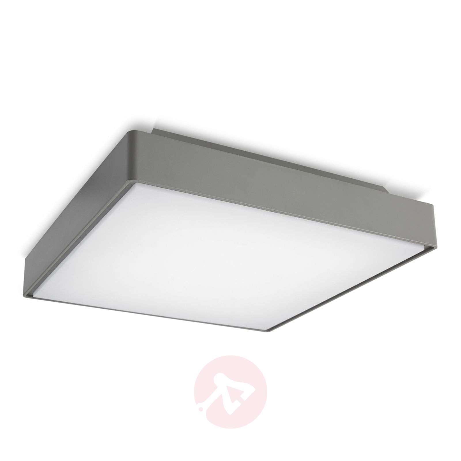 Kössel - nowoczesna zewnętrzna lampa sufitowa LED w kształcie kwadratu Lampa sufitowa LED firmy Kössel dzięki wbudowanym diodom LED i satynowanemu na biało dyfuzorowi zapewnia wyjątkowo przyjemny efekt świetlny. Ze swoimi wymiarami 40 x 40 cm oświetla żądany obszar na dużej powierzchni i może być zamontowana na przykład pod występem dachowym werandy. Obudowa, w której umieszczona jest satynowa szyba dyfuzora, ma kształt kwadratu i jest pomalowana na szary kolor. W ten sposób lampa sufitowa LED odznacza się prostotą i nowoczesnością, harmonijnie dopasowując się do najróżniejszych stylów budynków. Dzięki stopniowi ochrony IP65 lampa jest odporna na każde warunki atmosferyczne i może być stosowana nawet w pobliżu morza, ponieważ w całości wykonana jest z wysokiej jakości tworzywa sztucznego. Lampa posiada stopień wytrzymałości mechanicznej IK10, co oznacza, że jest wyjątkowo solidna i odporna na wstrząsy. Klasa efektywności energetycznej: A
