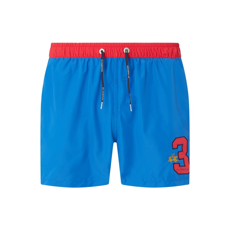 Spodenki kąpielowe męskie La Martina, Wytrzymały materiał , Luźny krój , Elastyczny pas w kontrastowym kolorze z tunelem, Boczne wpuszczane kieszenie, Detal z logo, Kieszeń z tyłu z patką na rzep, Podszewka z siatki, W zestawie z saszetką