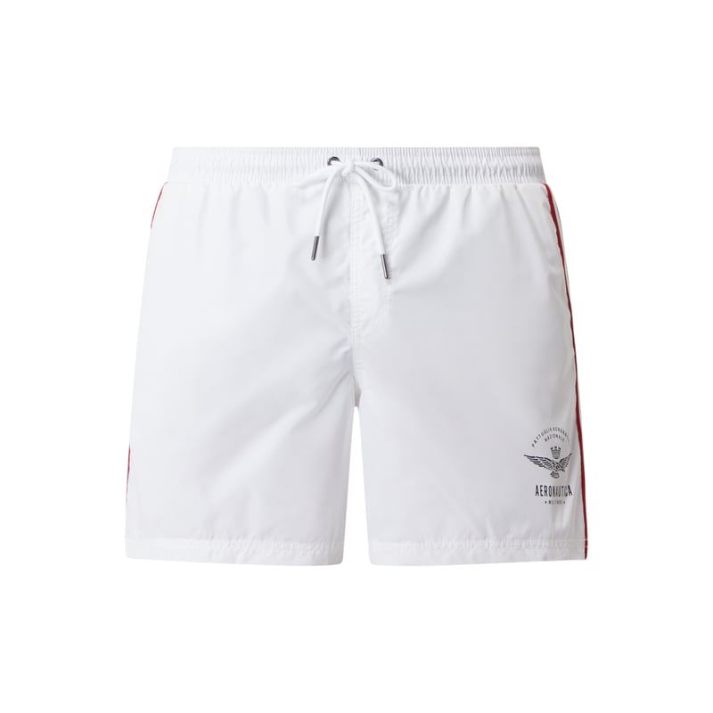 Spodenki kąpielowe męskie Aeronautica Militare, Wytrzymały materiał, Szorty, Elastyczny pas z tunelem , Wpuszczane kieszenie , Paski w kontrastowym kolorze, Logo, Kieszeń tylna zapinana na rzep, Podszewka z siateczki