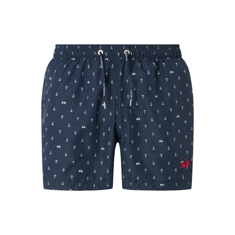 Spodenki kąpielowe męskie La Martina, Wytrzymały materiał , Luźny krój , Elastyczny pas z tunelem, Boczne wpuszczane kieszenie, Wyhaftowane logo , Kieszeń tylna z patką, Podszewka z siatki, W zestawie z saszetką