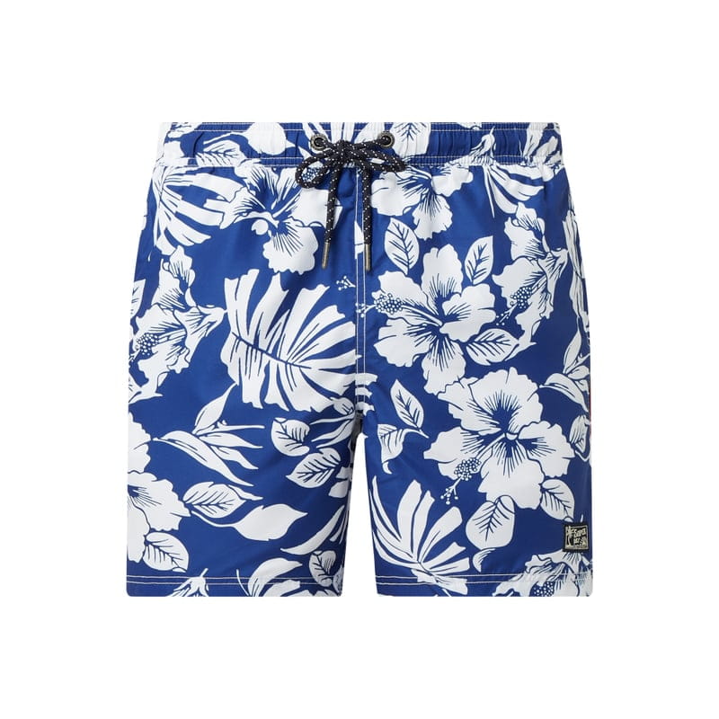Spodenki kąpielowe męskie Superdry, Wytrzymały materiał , Szorty, Wzór na całej powierzchni, Elastyczny pas z tunelem, Boczne wpuszczane kieszenie, Ozdobne lamówki, Logo, Krótkie rozporki po bokach, Kieszeń z tyłu z patką na rzep, Podszewka z siateczki