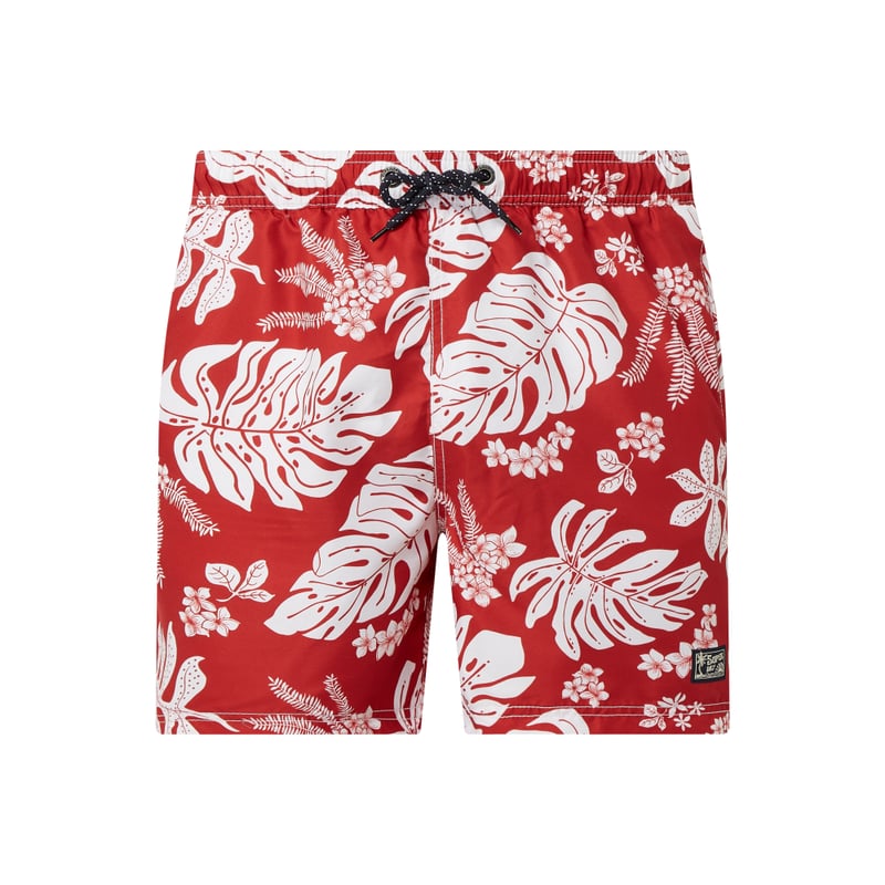 Spodenki kąpielowe męskie Superdry, Wytrzymały materiał , Szorty, Wzór na całej powierzchni, Elastyczny pas z tunelem, Boczne wpuszczane kieszenie, Ozdobne lamówki, Logo, Krótkie rozporki po bokach, Kieszeń z tyłu z patką na rzep, Podszewka z siateczki