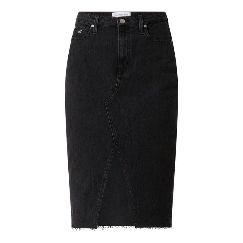 Spódnica jeansowa damska Calvin Klein Jeans, Mieszanka bawełny i elastanu, Prosty krój, Wysoki stan, Zapięcie na guzik i zamek błyskawiczny , 5 kieszeni, Postrzępiony dół , Rozporek, Naszywka z logo, Długość całkowita w rozmiarze 27: 69 cm, Szerokość w pasie w rozmiarze 27: 68 cm