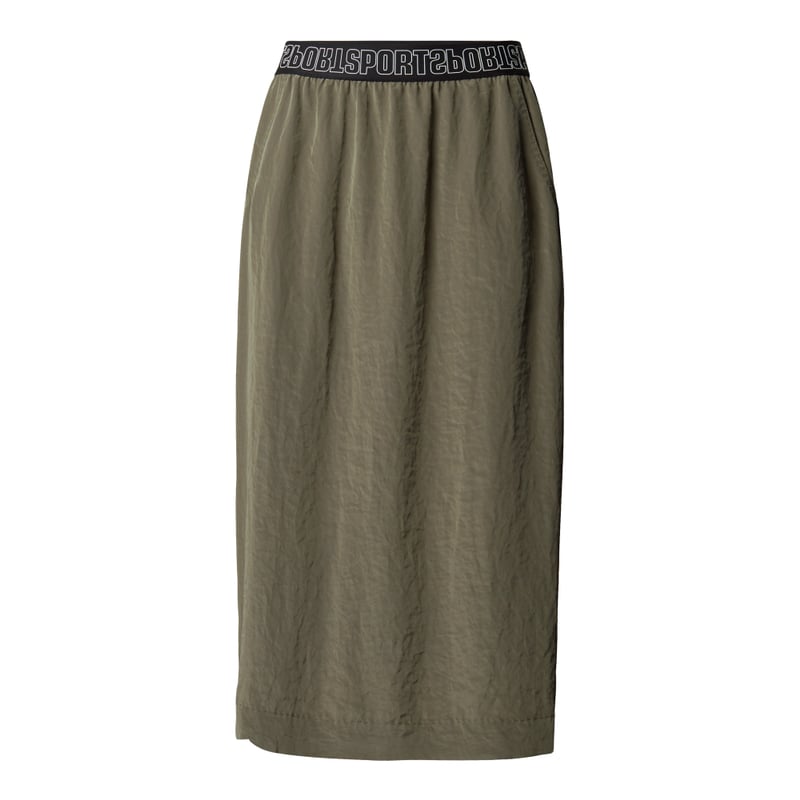 Spódnica midi damska Marc Cain, Wytrzymały materiał, Prosty krój, Elastyczny pas z napisem, Wpuszczane kieszenie, Rozcięcia po bokach, Szerokość w pasie w rozmiarze 36: 34 cm, Długość całkowita w rozmiarze 36: 76 cm